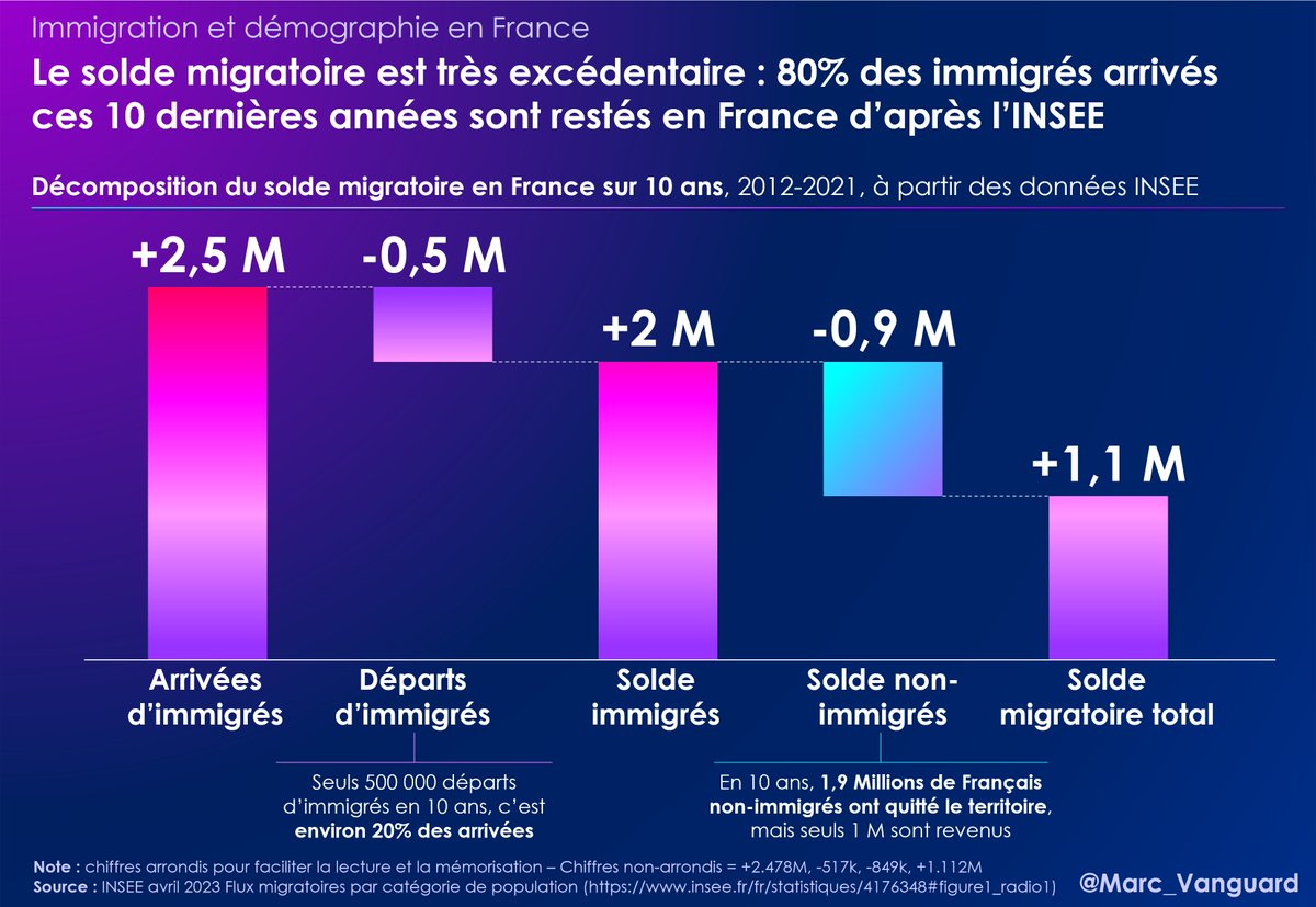 1⃣2⃣ Malgré tout, les flux continuent et s'additionnent. 👉 En cumulant les soldes migratoires annoncés par l'INSEE, on obtient ainsi un solde net de plus d'1 Million d'immigrés en 10 ans. 👉 C'est l'équivalent des populations de Lyon et Toulouse additionnées. https://t.co/3x0j52SFcf