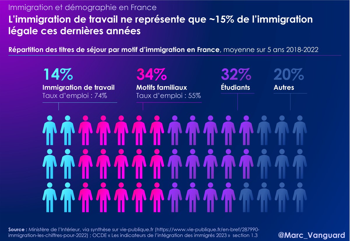 2⃣ Cette immigration régulière n'est pas une immigration de travail. 👉 Sur les 5 dernières années l'immigration de travail ne représente que 14% des titres de séjour accordés : https://t.co/yJYtZiILCZ