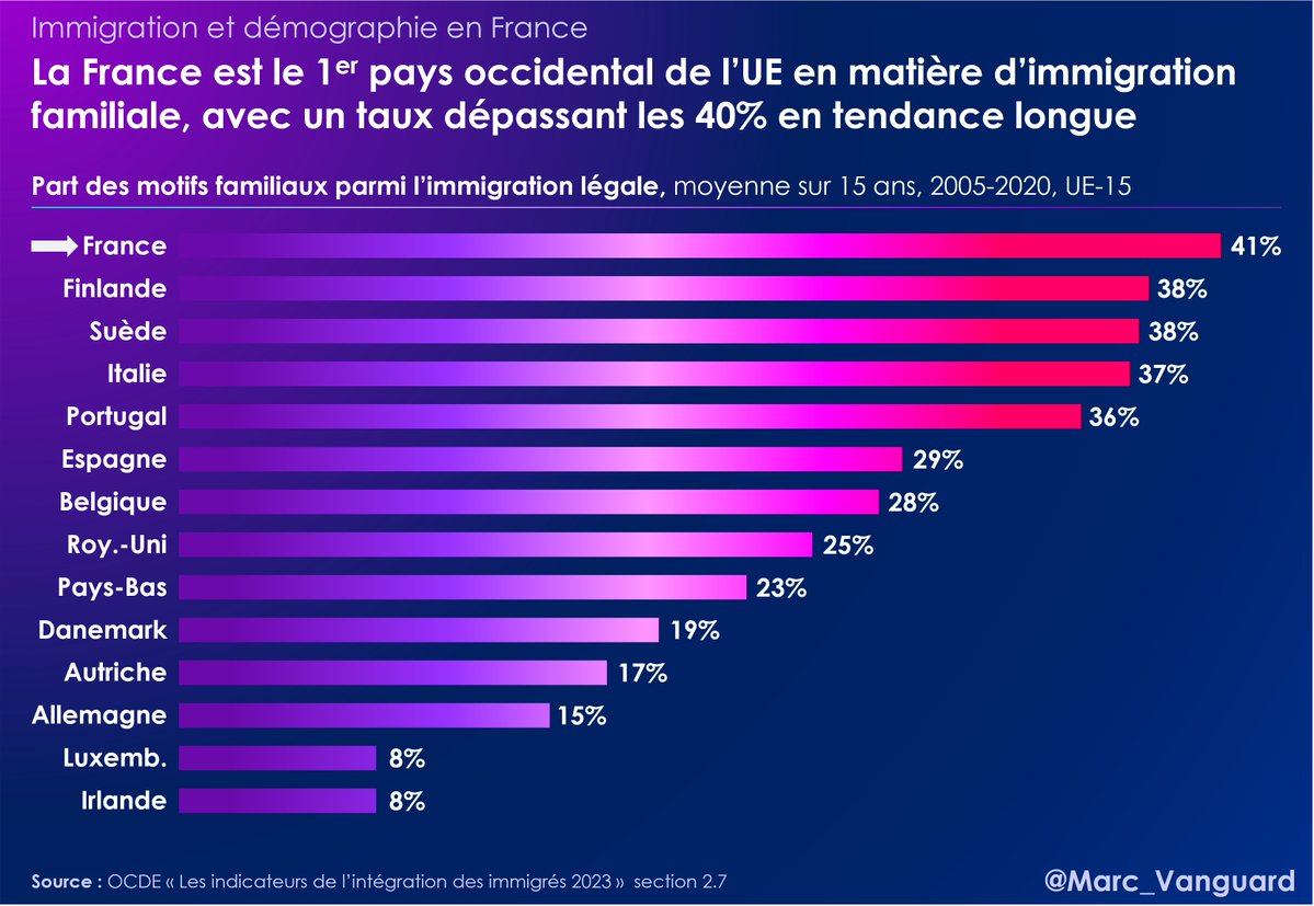 2⃣ L'immigration en France n'est pas une immigration de travail (seulement ~15% du total). 👉 La France est n°1 pour l'immigration familiale parmi tous les pays occidentaux de l'UE, avec une proportion dépassant les 40% en tendance longue. https://t.co/dXJnZIflki