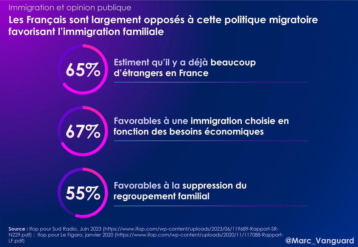 4⃣ Les Français sont largement contre cette politique migratoire : 👉 65% trouvent qu'il y a déjà trop d'étrangers. 👉 67% préfèreraient une immigration choisie en fonction de nos intérêts économiques. 👉 55% sont favorables à la fin du regroupement familial. https://t.co/MkqUyp7emN