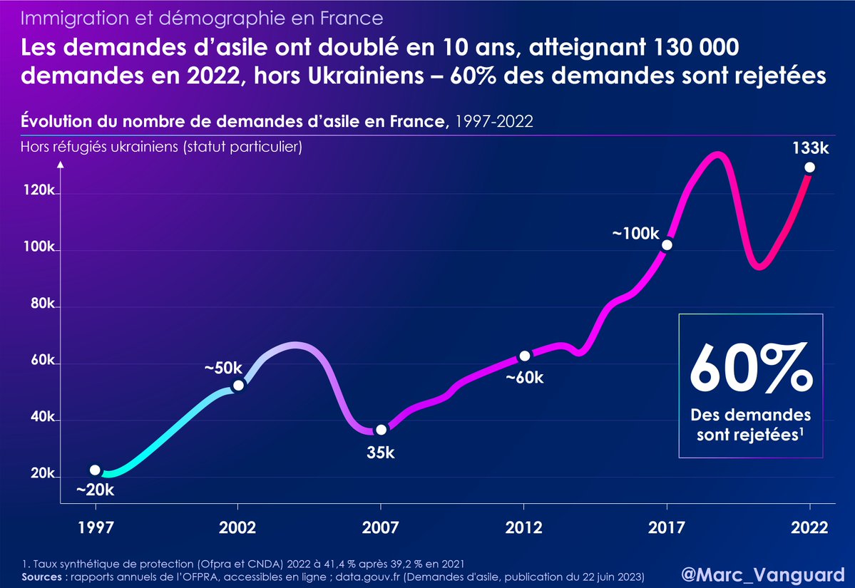 5⃣ En parallèle, la France fait face à un afflux massif de demandeurs d'asile (x2 en 10 ans). 👉 133 000 demandes d'asile en 2022 (plus que la population de Limoges ou Orléans !) 👉 60% des demandes sont rejetées… mais les déboutés quittent-ils vraiment le territoire ? https://t.co/lkxUjtC0IS