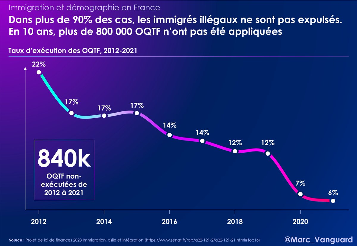 6⃣ Dans plus de 90% des cas, les immigrés illégaux ne sont pas expulsés. 👉 En 10 ans, 840 000 OQTF (Obligation de Quitter le Territoire Français) n’ont pas été appliquées. 👉 Le taux d'exécution des OQTF n'a jamais été aussi bas que sous G. Darmanin, plongeant à 6% en 2021 ! https://t.co/VyXNtt2oTL