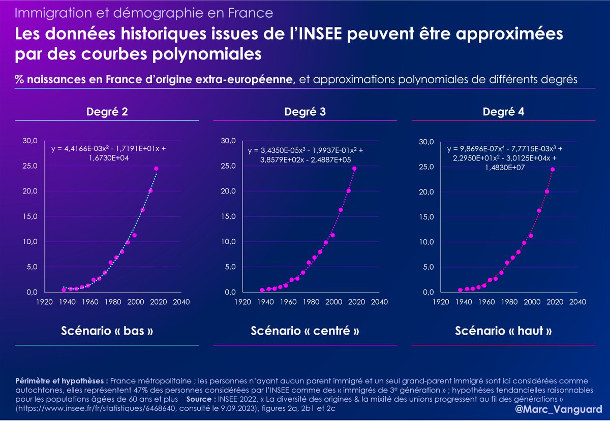 Pour faire simple, il s'agit des courbes de tendance qui collent au plus proche de la courbe des données historiques INSEE jusqu'à nos jours. J'ai tracé trois courbes, pour avoir une fourchette d'estimation. https://t.co/l7u8hAHYn2