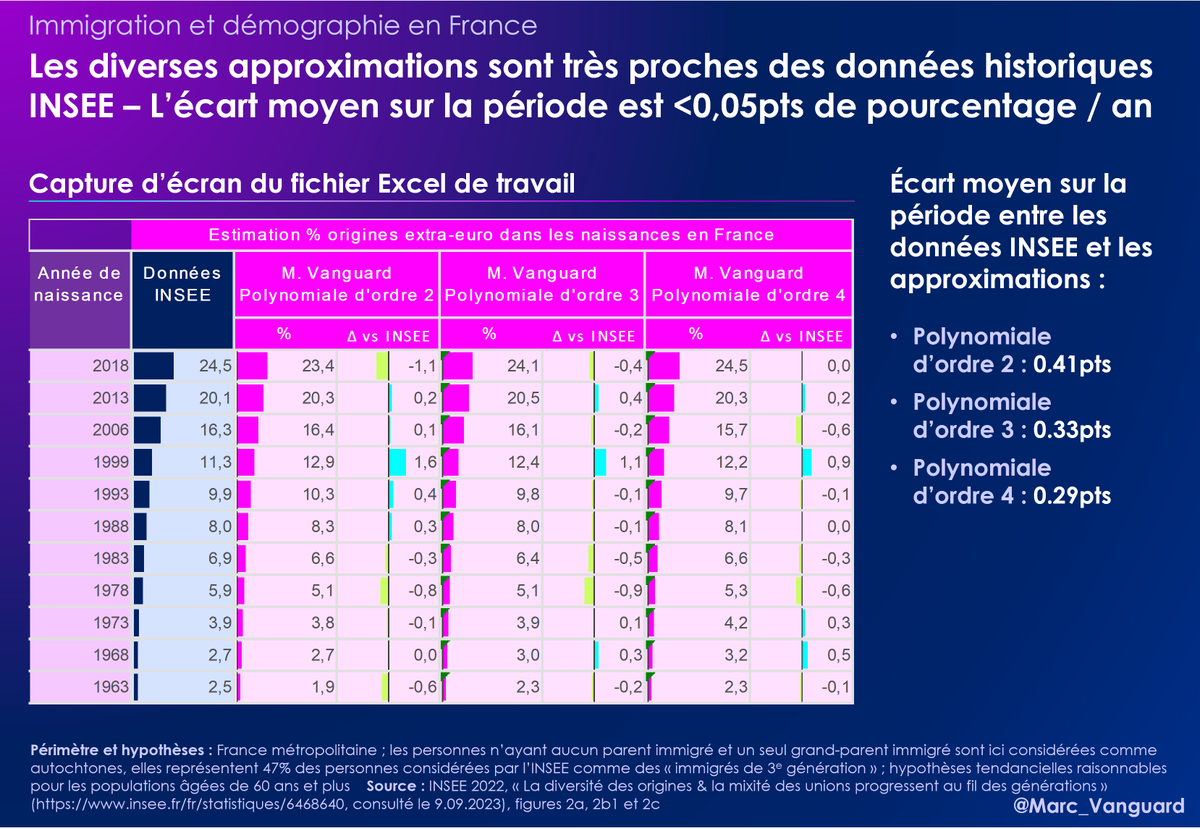 Le tableau ci-dessous révèle que les 3 courbes retenues pour l'approximation collent de très près à la courbe réelle INSEE. 👉 Peu importe la courbe choisie, l'écart moyen annuel aux données INSEE est inférieur à un demi-point de pourcentage. https://t.co/OcI1jFNnYJ