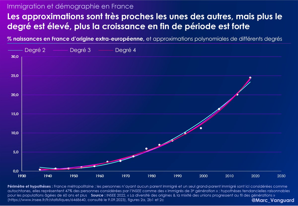 On note toutefois que la polynomiale de degré 4 présente un taux de croissance plus élevé en fin de période. Lorsqu'on la "prolongera" sur les années futures, elle prédira donc un scénario avec un % de naissances d'origine extra-européenne plus élevé. https://t.co/ezYxzWNzfU