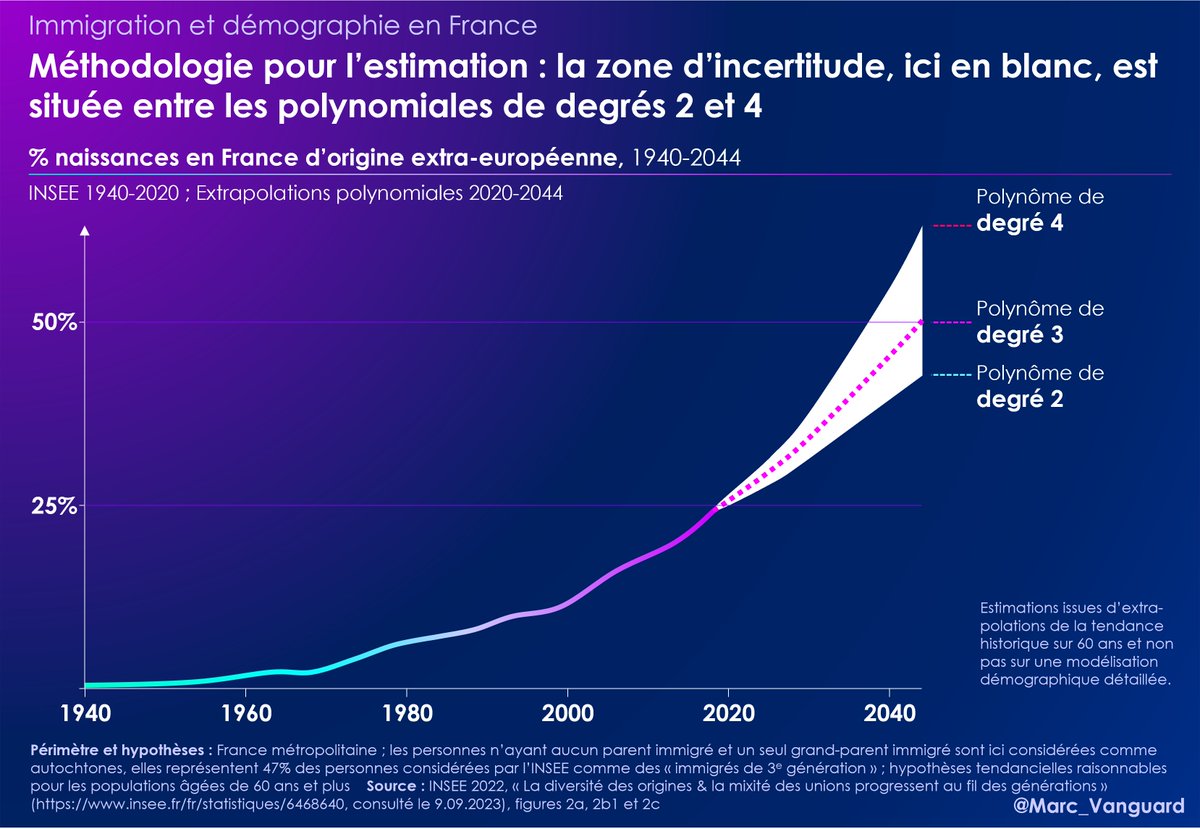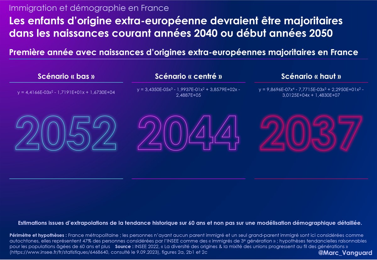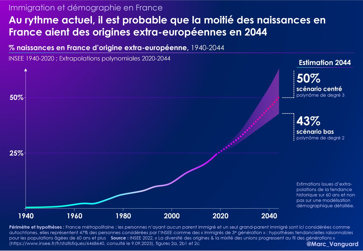 👉 Ainsi, selon l'approximation retenue, on serait à 50% de naissances extra-européennes dans les naissances entre 2052 et … 2037. Avec une estimation "centrée" à 2044. Personnellement, j'ai du mal à croire au scénario 2037 qui suppose une accélération de l'évolution actuelle. https://t.co/G0ouVtfIyM