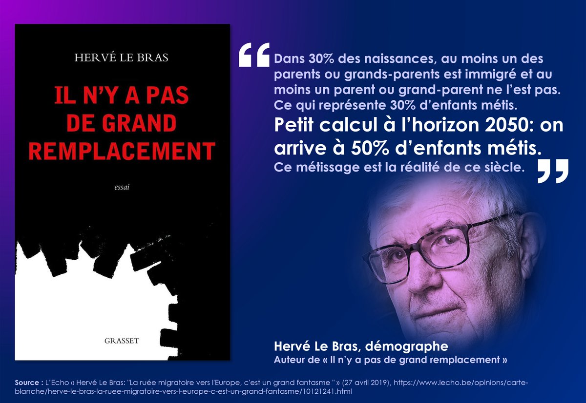 Ce résultat n'est pas très éloigné des calculs du démographe Hervé Le Bras, auteur du livre "Il n'y a pas de Grand Remplacement". Il prédit ainsi "50% d'enfants métis à horizon 2050" 👇