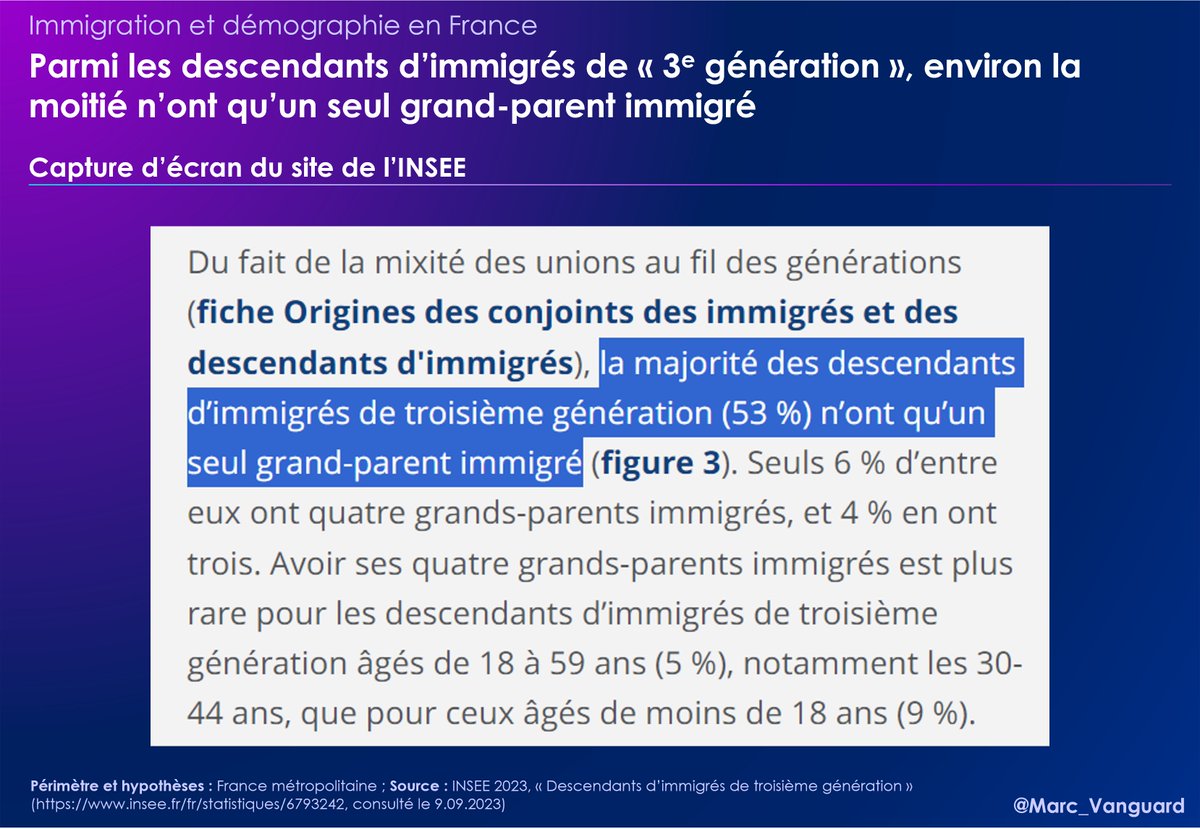 Parmi les petits-enfants d’immigrés, environ la moitié n’ont qu’un seul grand-parent immigré. ➡️ Par conséquent, il me semblait plus juste d'exclure de la définition des "naissances issues de l'immigration" ceux qui n'ont qu'un seul immigré parmi leurs 4 grands-parents. https://t.co/C8b9mzrs4l