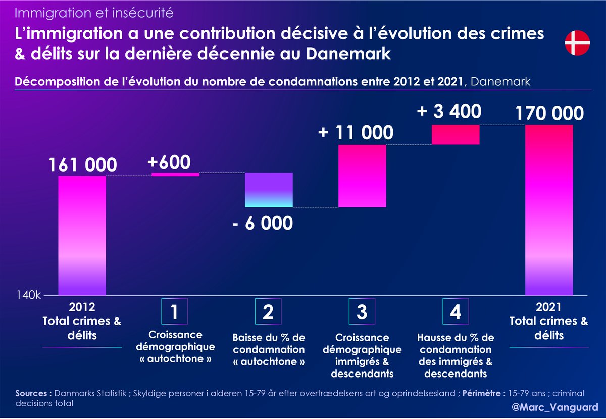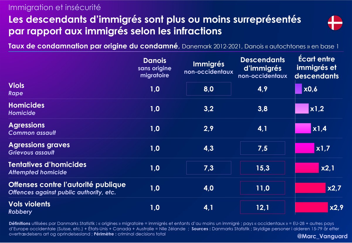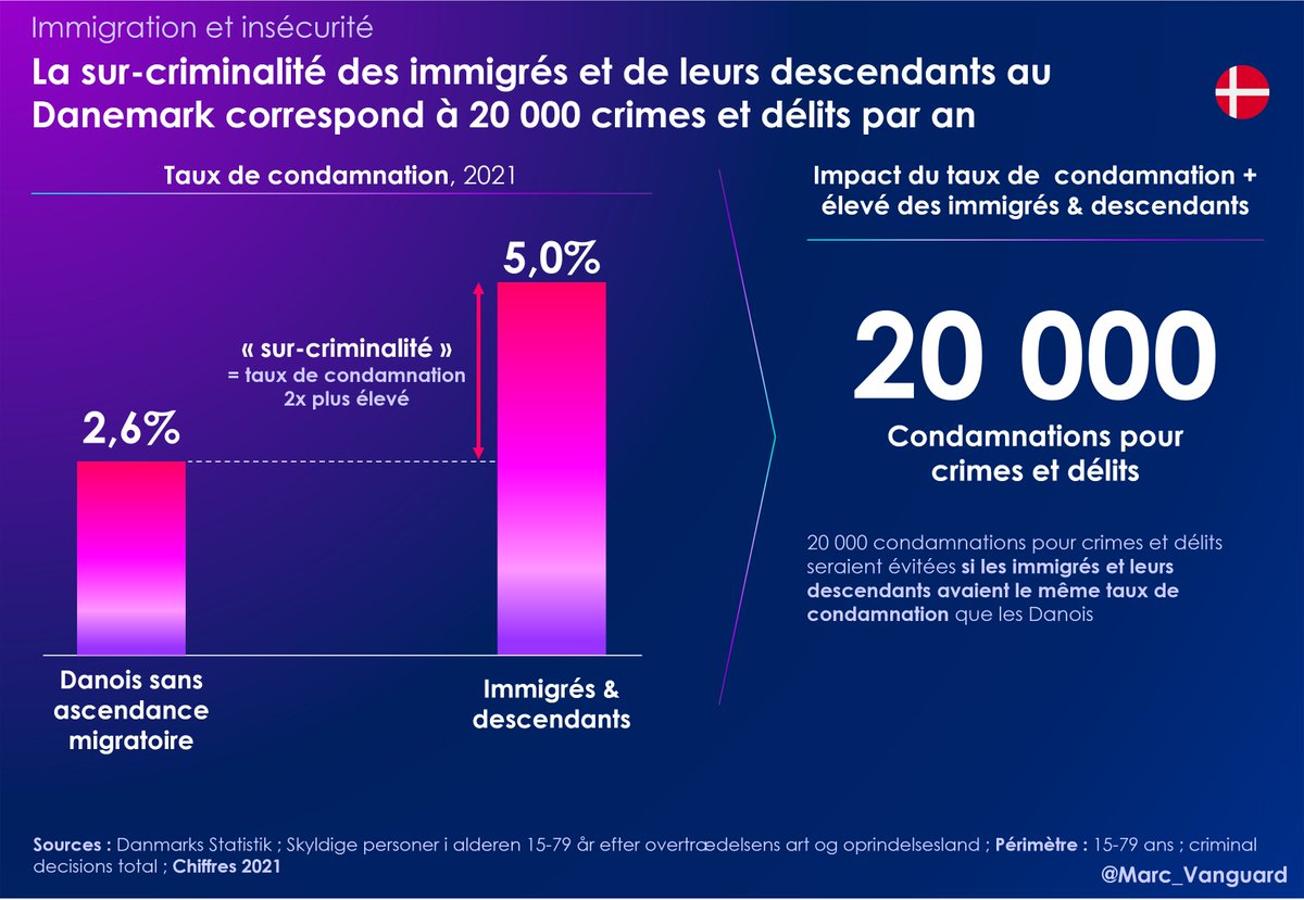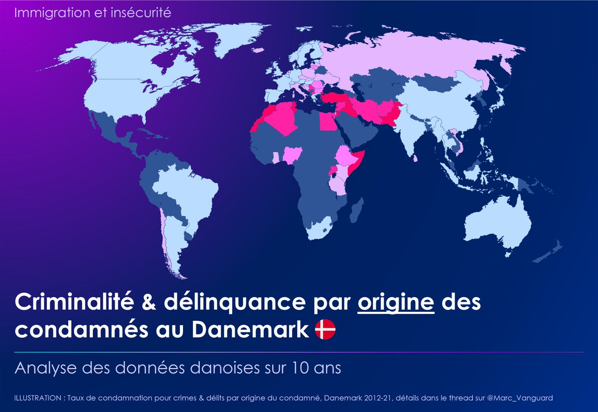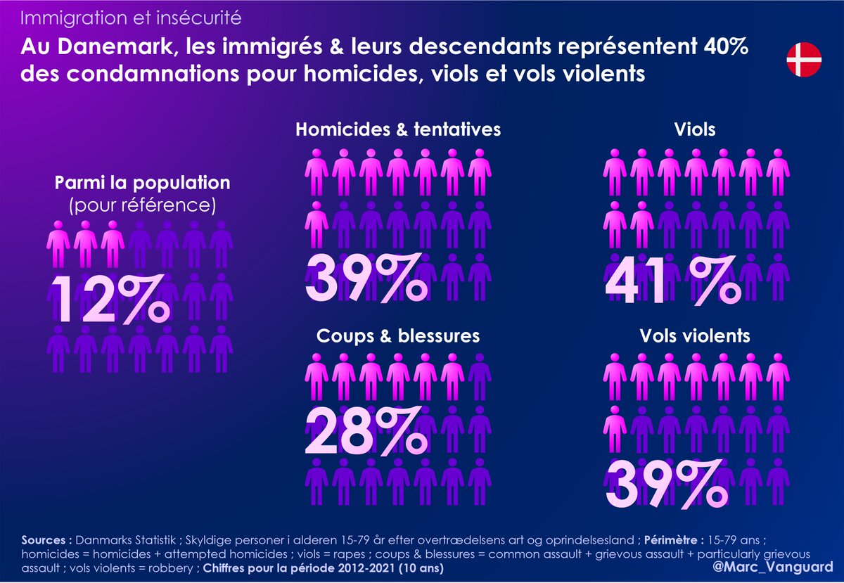 1⃣ Au Danemark, les auteurs d'infractions sont catégorisés par origine, et non pas par nationalité. 👉 Les immigrés & leurs descendants (=enfants) représentent 40% des condamnations pour homicides, viols et vols violents alors qu'ils ne sont que 12% dans la population. https://t.co/4V9M4vt8mC