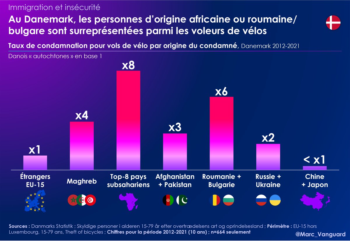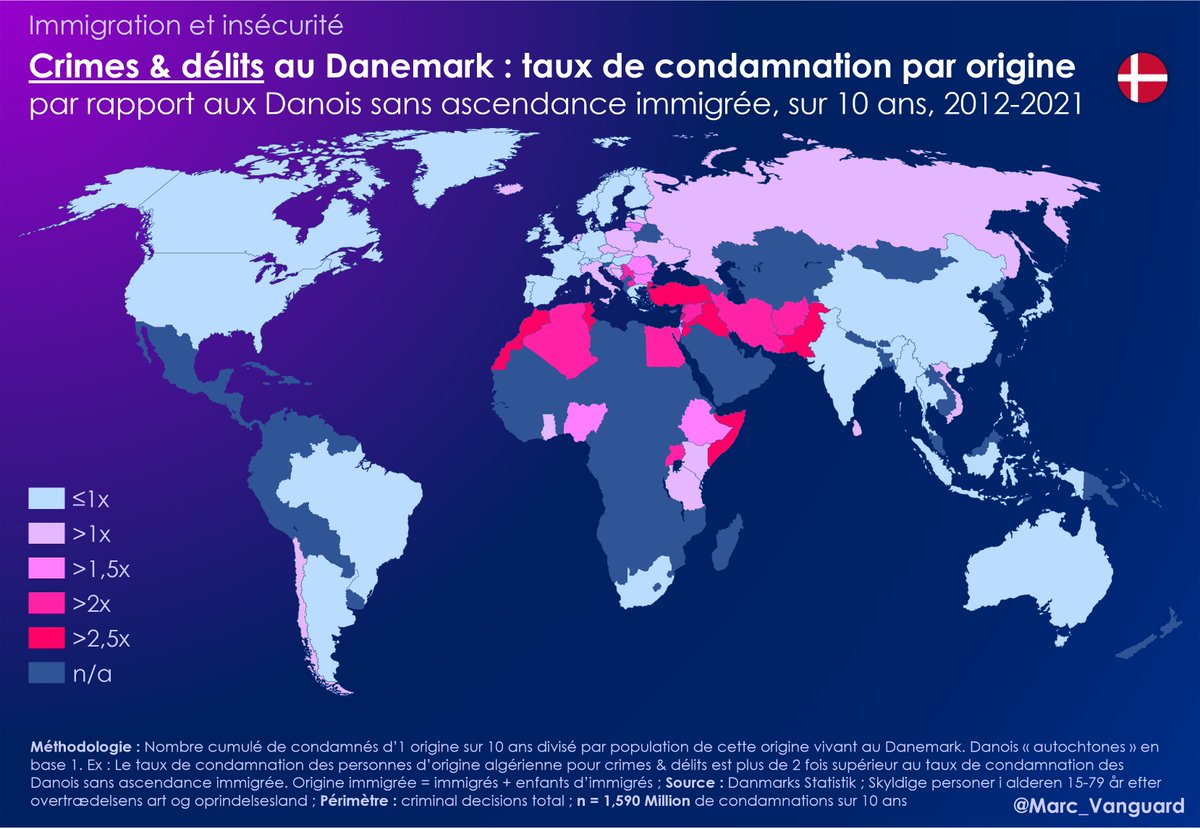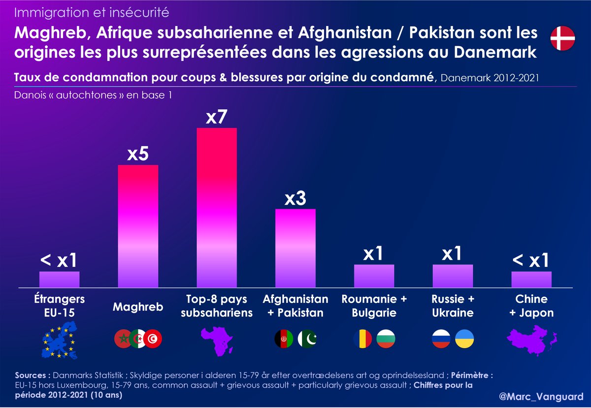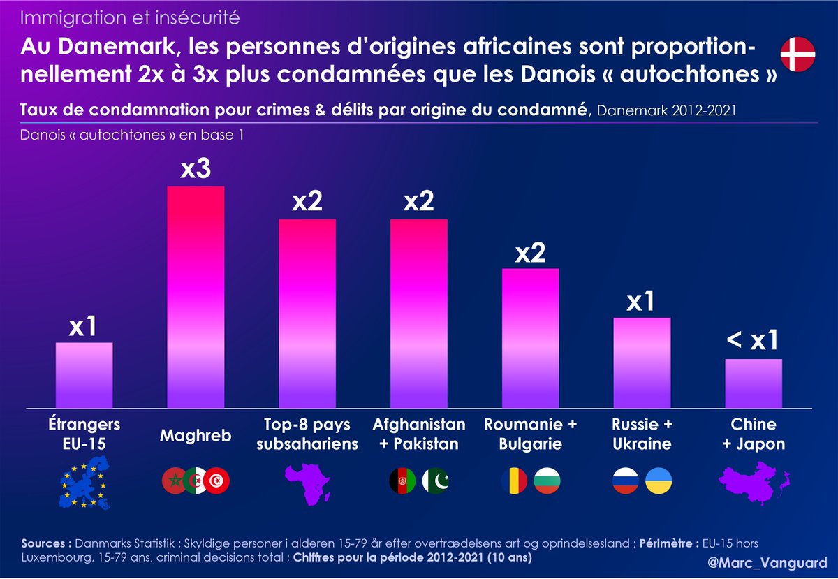 5⃣ Ainsi, les taux de condamnation diffèrent d'1 origine à l'autre. Si l'on prend les Danois "autochtones" en base 1, on obtient les taux de condamnations suivants : 👉 Maghreb: 3 👉 Reste de l'Afrique, Afghanistan/Pakistan: 2 👉 Europe occidentale: 1 (même taux que les Danois) https://t.co/Nj96yv3zIy