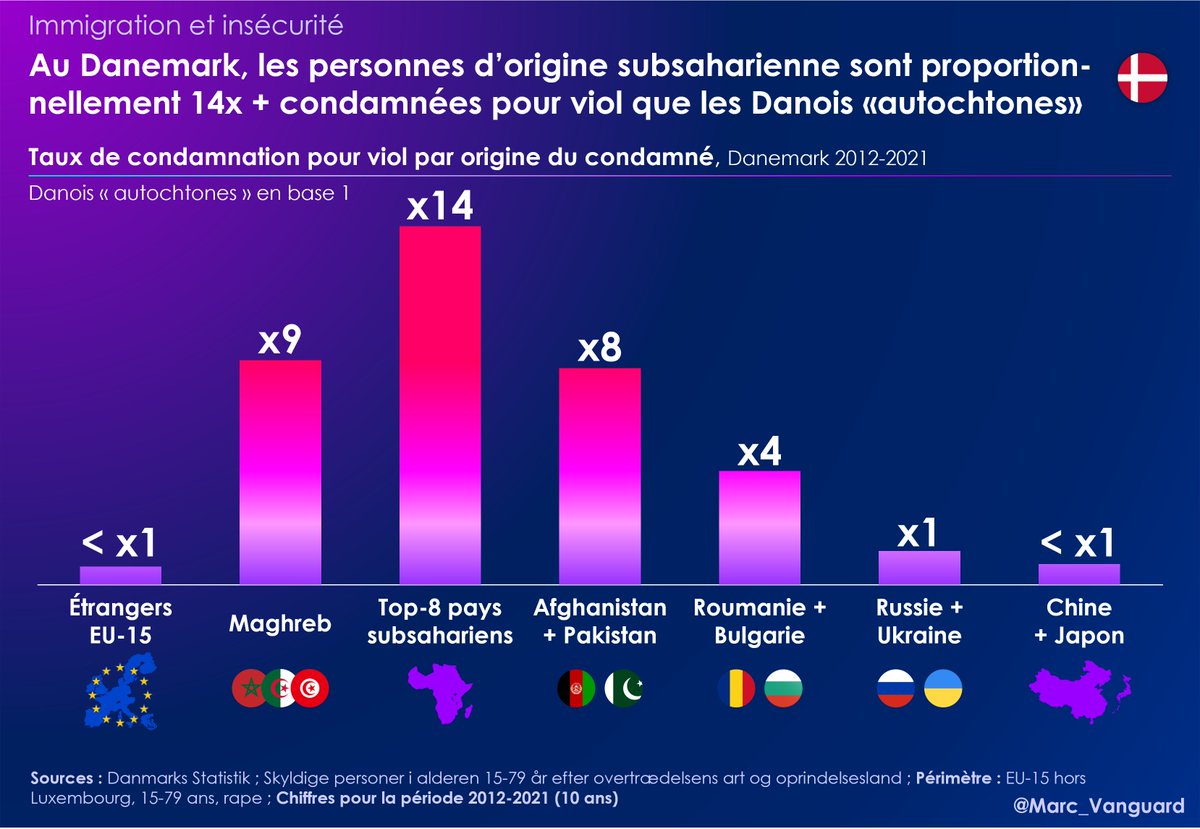 7⃣ Le taux de condamnation des personnes originaires d'Afrique subsaharienne pour viols est même QUATORZE FOIS plus élevé que celui des Danois "autochtones". Les origines maghrébines et afghanes/pakistanaises ne sont pas en reste, aux alentours des 8 à 9x. https://t.co/I0h3GM4xdu