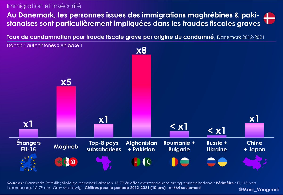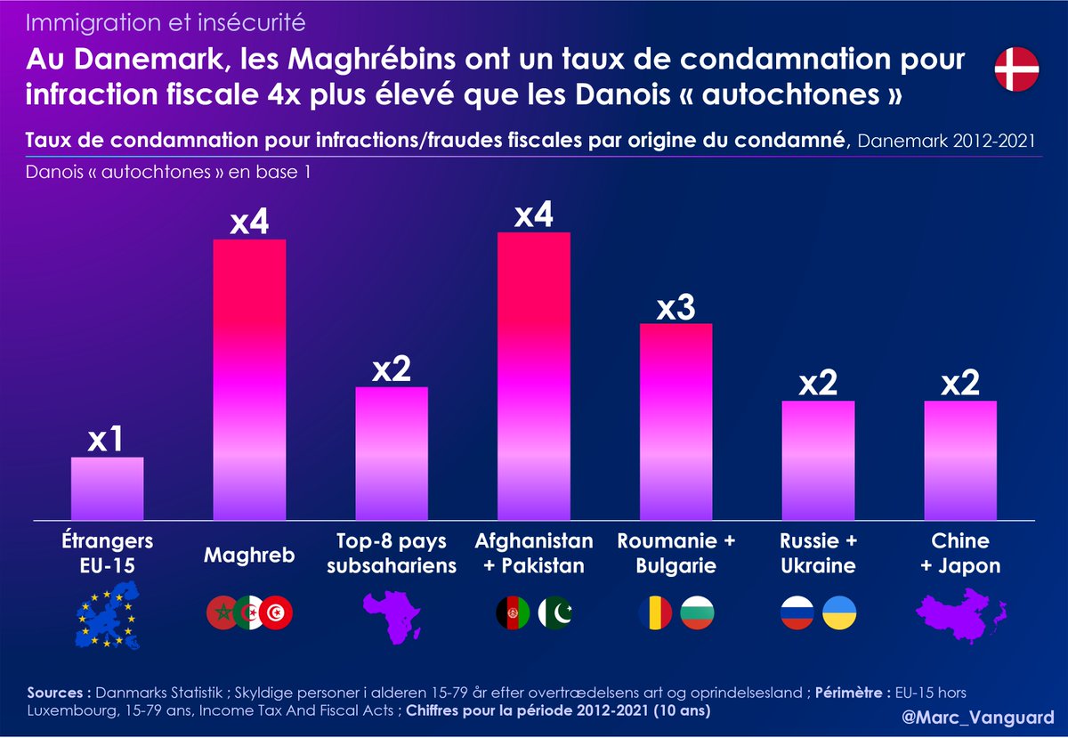 8⃣ Souvent réclamées, les stats sur la fraude fiscale existent au Danemark. 👉 Elles révèlent que les Maghrébins et les Pakistanais sont particulièrement surreprésentés dans ce types d'infractions, avec des taux de condamnation 4x plus élevés que les Danois "autochtones". https://t.co/jfmV3pFWQX