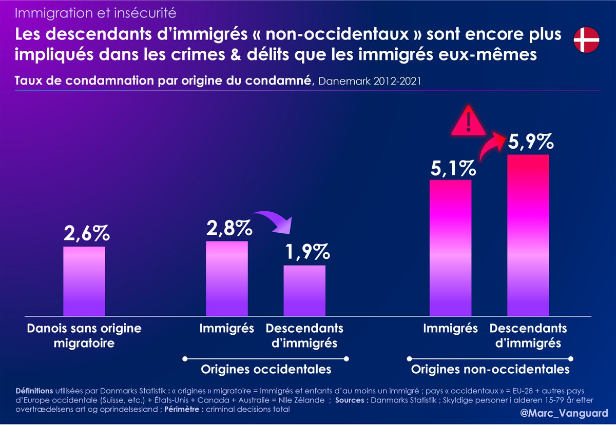 2⃣ Les enfants d’immigrés «non-occidentaux» sont encore + impliqués dans la délinquance que les immigrés eux-mêmes. Voici les taux de condamnation qui trahissent l'échec de l'assimilation : 🟠 Immigrés non-occidentaux 5,1% 🔴 Leurs enfants 5,9% ❗️ 🟢 Danois "autochtones" 2,6% https://t.co/ruoP5WX6hW