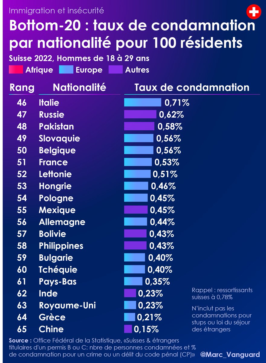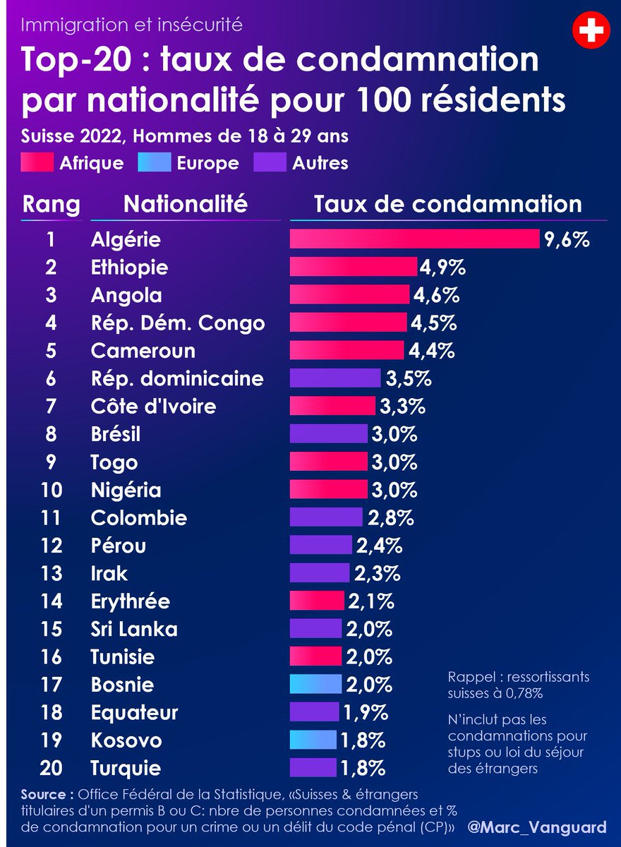 🚨 Immigration & insécurité 🇨🇭 La Suisse est le seul pays d'Europe à publier les taux de condamnation de 120 nationalités différentes, avec une précision inégalée. Découvrez dans ce fil🔟conclusions, parfois surprenantes, issues de ces chiffres ⬇️ https://t.co/7ag78S1c1s