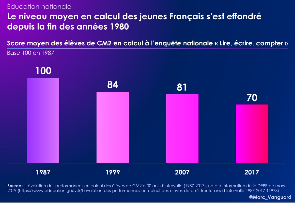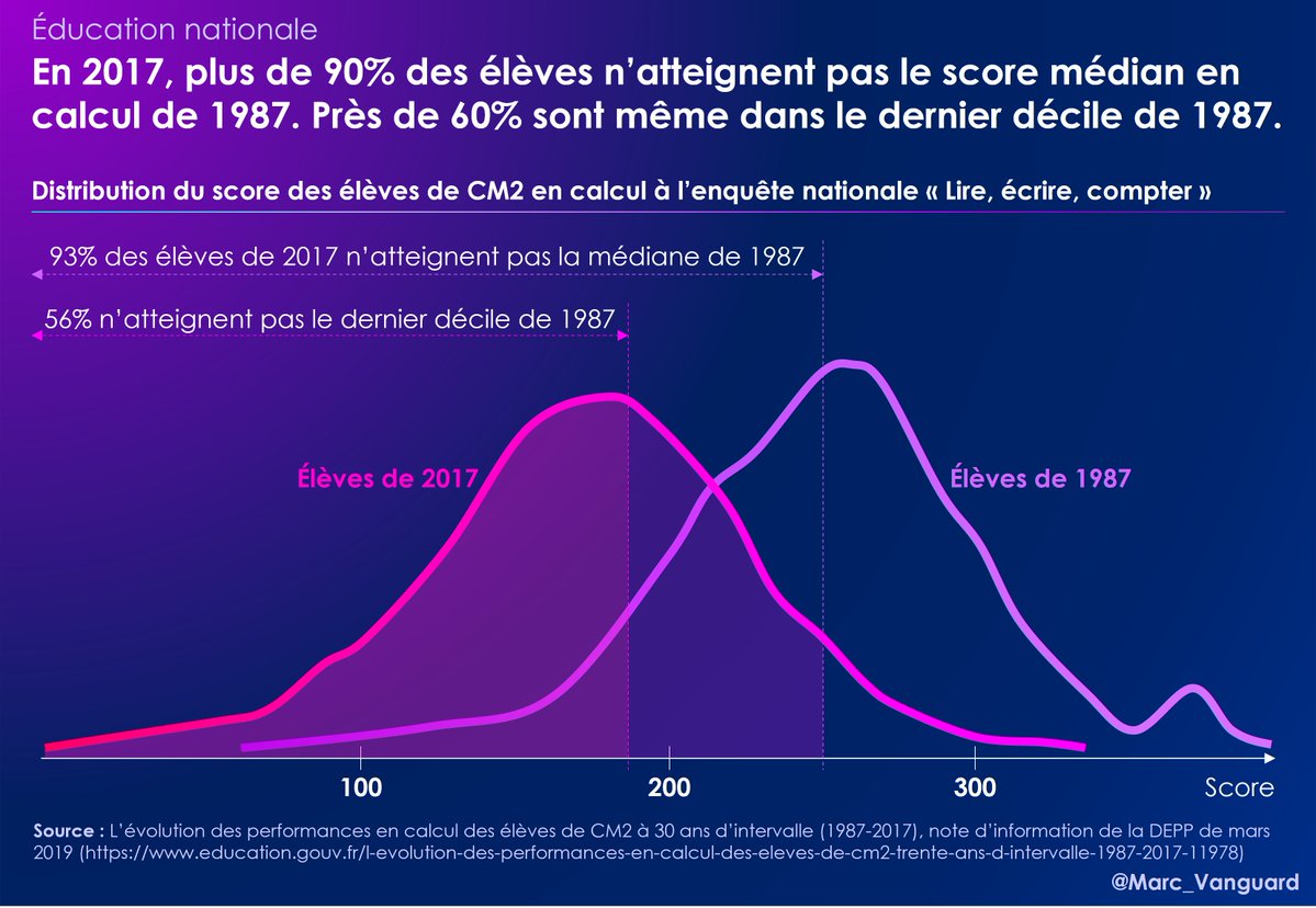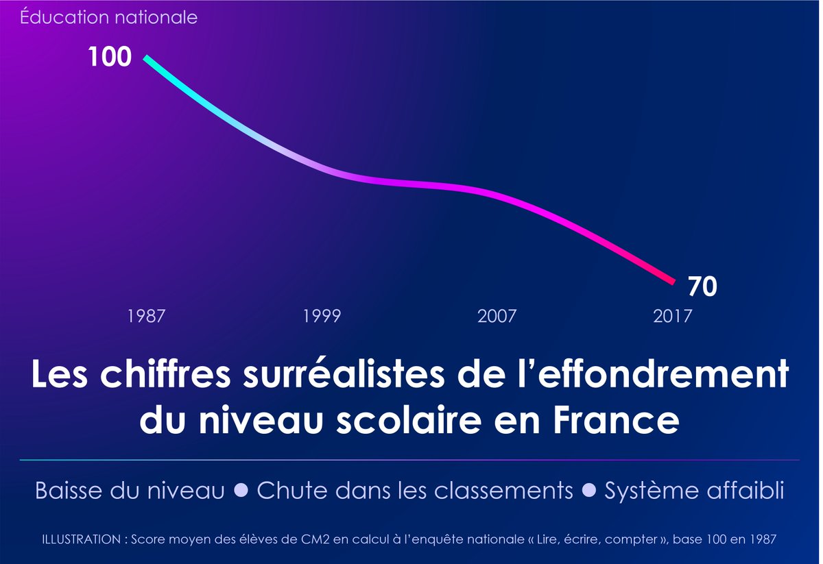La baisse de niveau est alarmante : 👉 En 2017, plus de 90% des élèves n'atteignent même pas le score médian en calcul de 1987. 👉60% des élèves sont désormais en-dessous du score qu'atteignaient jadis 90% des élèves. https://t.co/OtP2B1lZKF