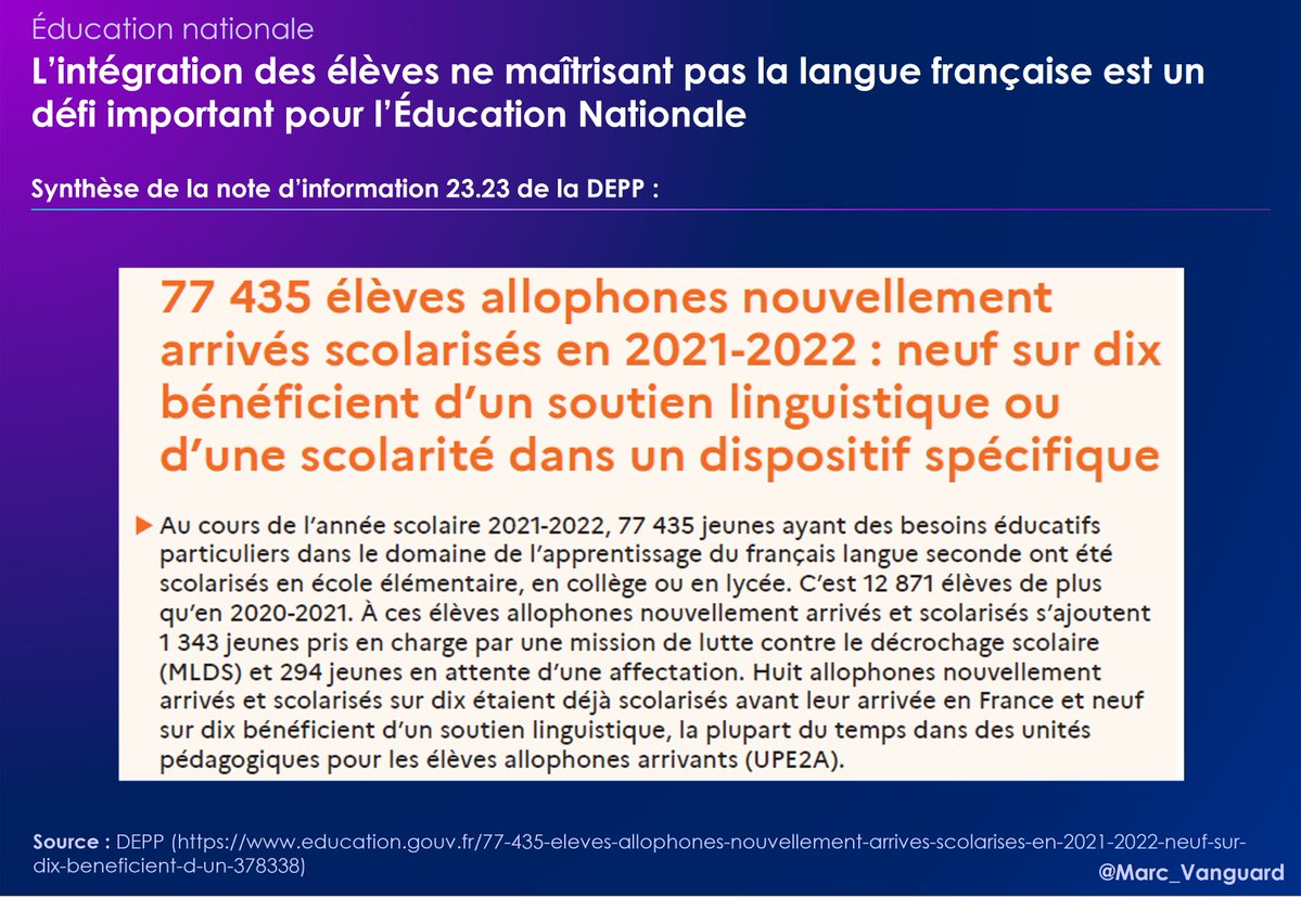 L'intégration d'élèves immigrés ne parlant pas Français est elle aussi un grand défi. 👉 + 80 000 élèves allophones accueillis en 2021-22 dont : 👉 53% ayant un retard scolaire d'1 an ou + (au collège) 👉 20% pas scolarisés avant d'arriver en France https://t.co/RgxEQP84j3