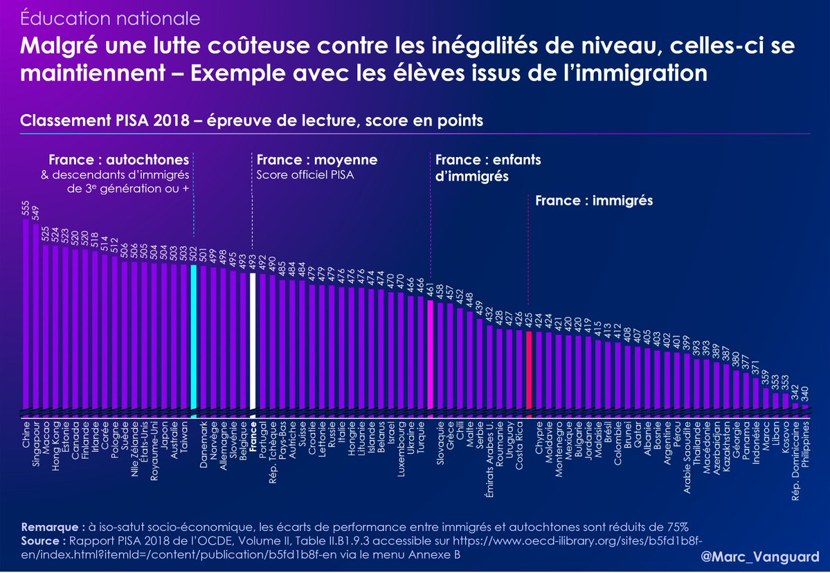 Des inégalités de tous types persistent malgré les investissements réalisés pour les réduire. Exemple au classement PISA Reading : 👉 Les immigrés sont 76pts plus bas que les autochtones 👉 Les autochtones sont 10pts au-dessus de la moyenne française, proches du Japon & de Taïwan https://t.co/6baX88isl2