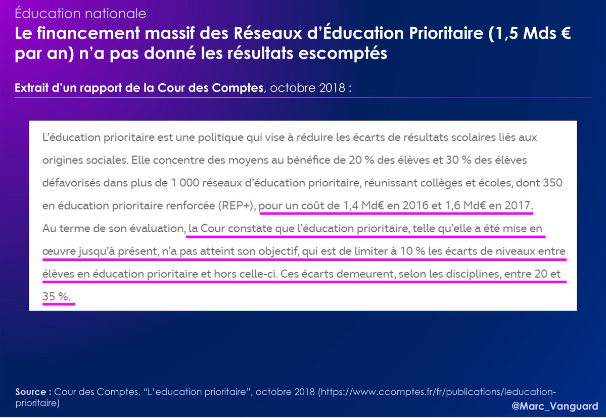 La Cour des Comptes soulignait en 2018 que les 1,5 Milliards d'euros investis chaque année dans les réseaux d'éducation prioritaire (REP) n'ont eu que peu d'impact. 👉 Objectif : 10% d'écart de niveau entre REP et non-REP 👉 Résultat : 20% à 35% selon les disciplines https://t.co/NQLrBVkxso