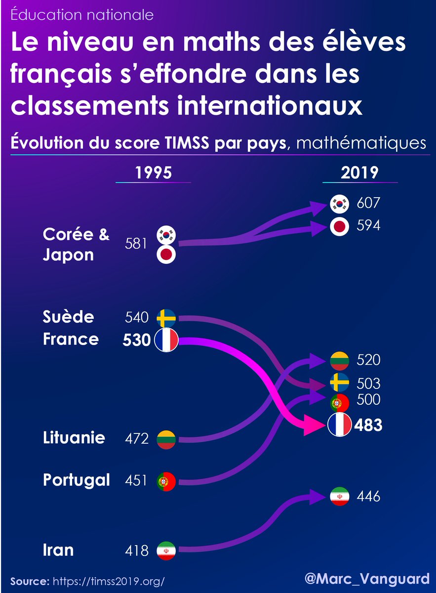 Les classements internationaux montrent aussi l'effondrement du niveau de maths de nos élèves, comme en témoigne l'étude TIMSS (ici équivalent fin de 4e). 👉 Le score français a baissé de près de 10% en 25 ans. 👉La France est dépassée par de nombreux pays (ex : 🇵🇹, 🇱🇹) https://t.co/XyiChxlCo3
