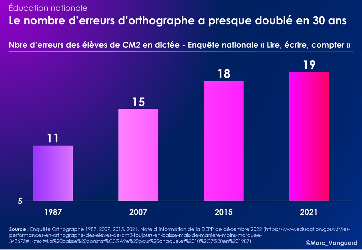 En orthographe aussi, le niveau des Français est en chute libre. 👉 Pour une même dictée, le nombre de fautes a augmenté de plus de 70% entre 1987 et 2021 https://t.co/n8QzulXF4I