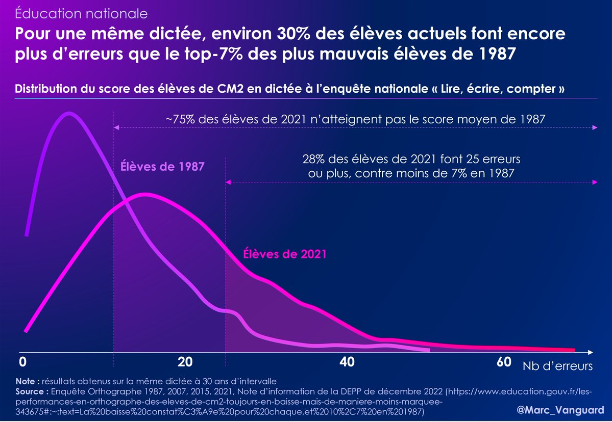 Les excellents élèves sont moins nombreux. Quant aux moins bons élèves, ils sont à la fois + nombreux et bien + mauvais qu'auparavant. 👉 Seulement 7% des élèves atteignaient le score désastreux de 25 erreurs ou plus en 1987 👉 Pour la même dictée, ils sont désormais 28% ! https://t.co/RzFgLJZQBs