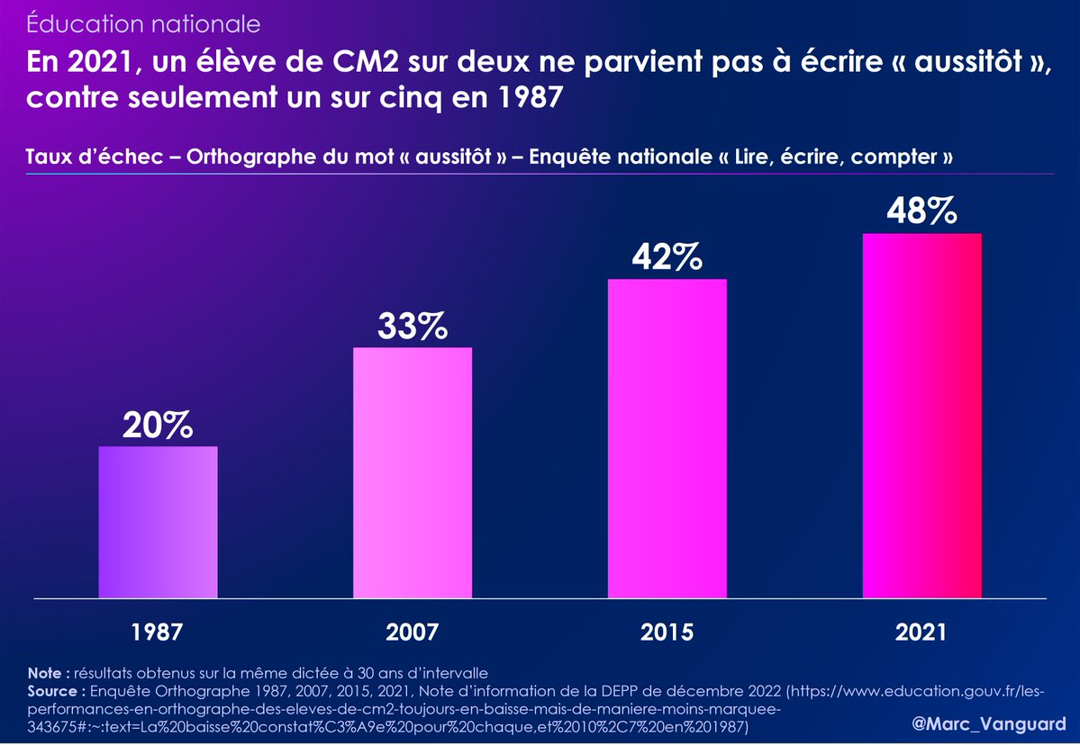 👉 Concrètement, un enfant de 10 ans sur deux ne sait pas écrire "aussitôt". 👉 80% des enfants de 10 ans écrivaient ce mot sans erreur en 1987 https://t.co/D1LkmuNs3s