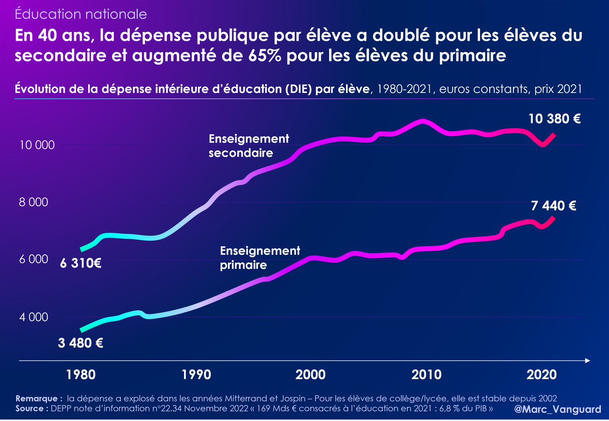 Le niveau baisse, les salaires des professeurs sont (trop ?) bas, mais pourtant la dépense d'éducation par élève a explosé ! 👉 +115% en 40 ans pour l'enseignement primaire 👉+65% pour le collège/lycée https://t.co/E03se3Gav3