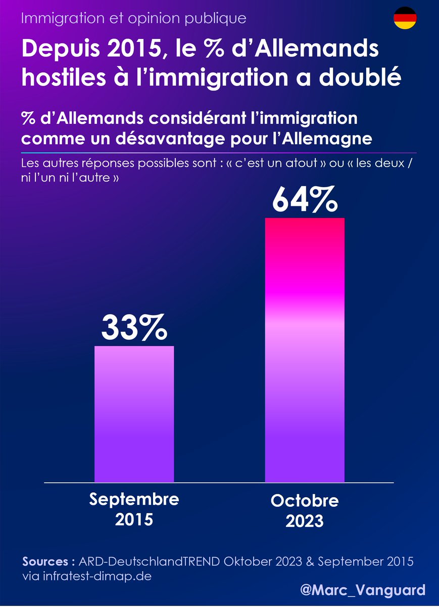 🟣 Ils sont désormais 64% à voir l'immigration comme un désavantage de l'Allemagne, contre seulement 33% en 2015, un revirement historique de l'opinion publique outre-Rhin, qui s'approche ainsi des scores qu'on connaît en France.