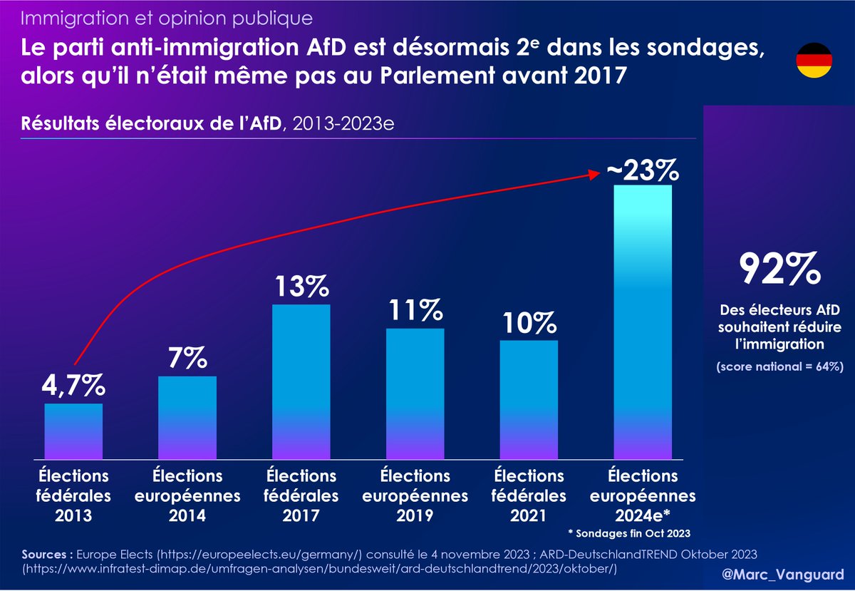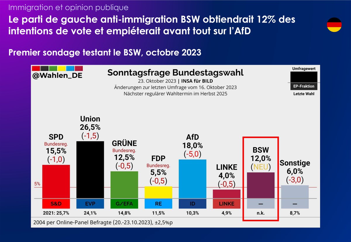 A gauche aussi, les choses évoluent, avec la création d'un nouveau parti de gauche anti-immigration, le BSW. 👉 Issu de Die Linke (l'équivalent de LFI chez nous), ce parti est déjà crédité de 12% d'intentions de vote, déjà loin devant les 4% de Die Linke. https://t.co/AS9w7SXADc