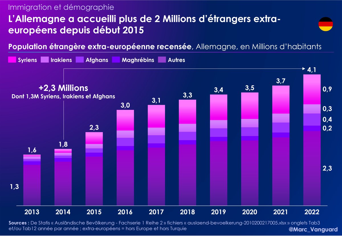 Cette décision va durablement marquer la démographie allemande : 👉 Il y a 2,3 M d'étrangers extra-européens de + en 2022 par rapport à 2014 (+140% en moins de 10 ans !) 👉 Dont plus de la moitié venant de Syrie, d'Irak & d'Afghanistan 👉 Mais aussi 60 000 Maghrébins au passage