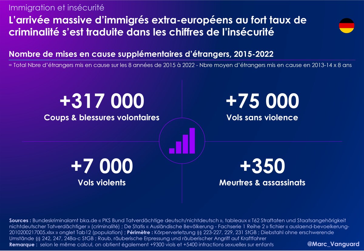 La forte augmentation de la population étrangère en Allemagne à partir de 2015 a ainsi été associée à un grand nombre d'infractions. En nombre de mises en cause, on parle de : 👉 320 000 agressions 👉 80 000 vols 👉 >300 meurtres