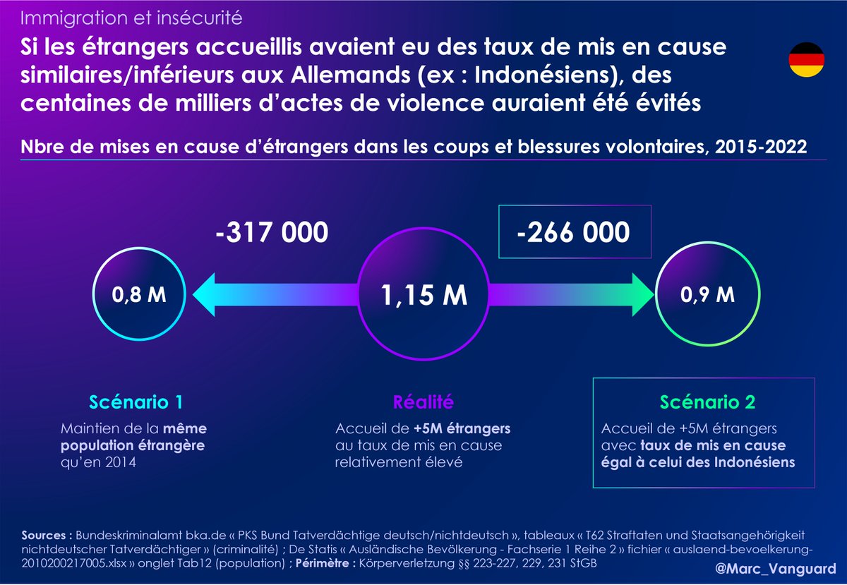 💭 Imaginons un instant qu'au lieu d'accueillir massivement des Syriens, Irakiens ou Bulgares, l'Allemagne n'ait accueilli que des Indonésiens, au taux de mis en cause bien plus bas. 👉 On aurait théoriquement évité 270 000 mises en cause pour agressions depuis 2015.
