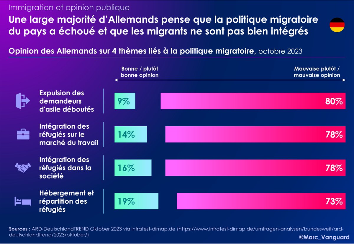 🚨 Toujours est-il qu'aujourd'hui, les Allemands estiment que la politique migratoire lancée par A. Merkel a échoué. 👉 Ils sont 78% à juger que l'intégration des immigrés est mauvaise, à la fois sur le marché du travail et dans la société en général.