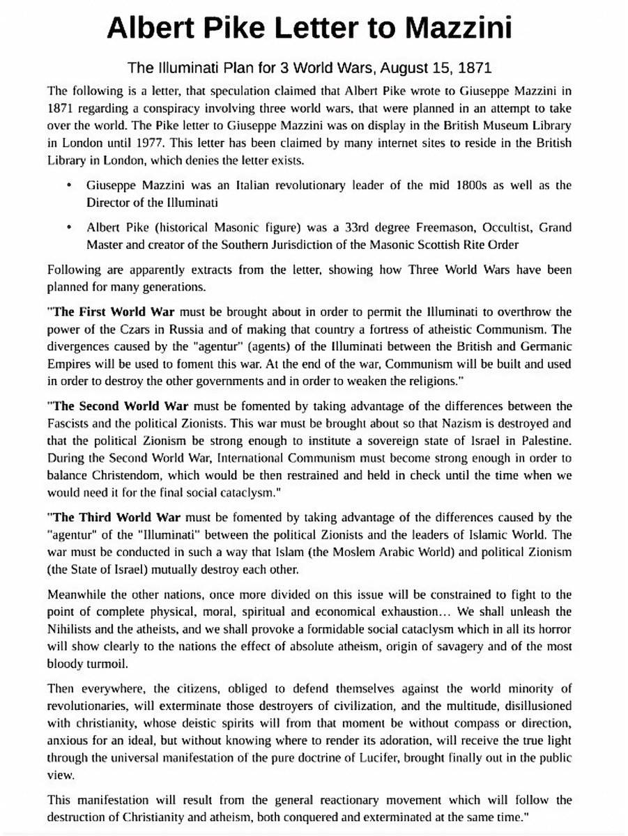 In case you didn’t already know, WW1, WW2, & WW3 (which started recently) were already planned out & scripted in detail 150+ years ago. Albert Pike explained the exact reasons for WW1 & WW2 as well as their outcomes in a letter he wrote in 1871. Insane. 😳 What did he say about WW3? Well everyone on Earth needs to see that so they know what these people are about to try & do. They plan on WW3 allowing them to accomplish their ultimate goal which is the destruction of Christianity & ushering in “the universal manifestation of the pure doctrine of Lucifer”. The following are excerpts from the letter Pike wrote explaining all of this in 1871 that was displayed in the British Museum Library until 1977 when people started noticing what it said & it had to be removed for obvious reasons lol. Was Albert Pike just REALLY good at guessing the future, or… ? 🤔🧐 It’s time to wake up people. Rise & shine.