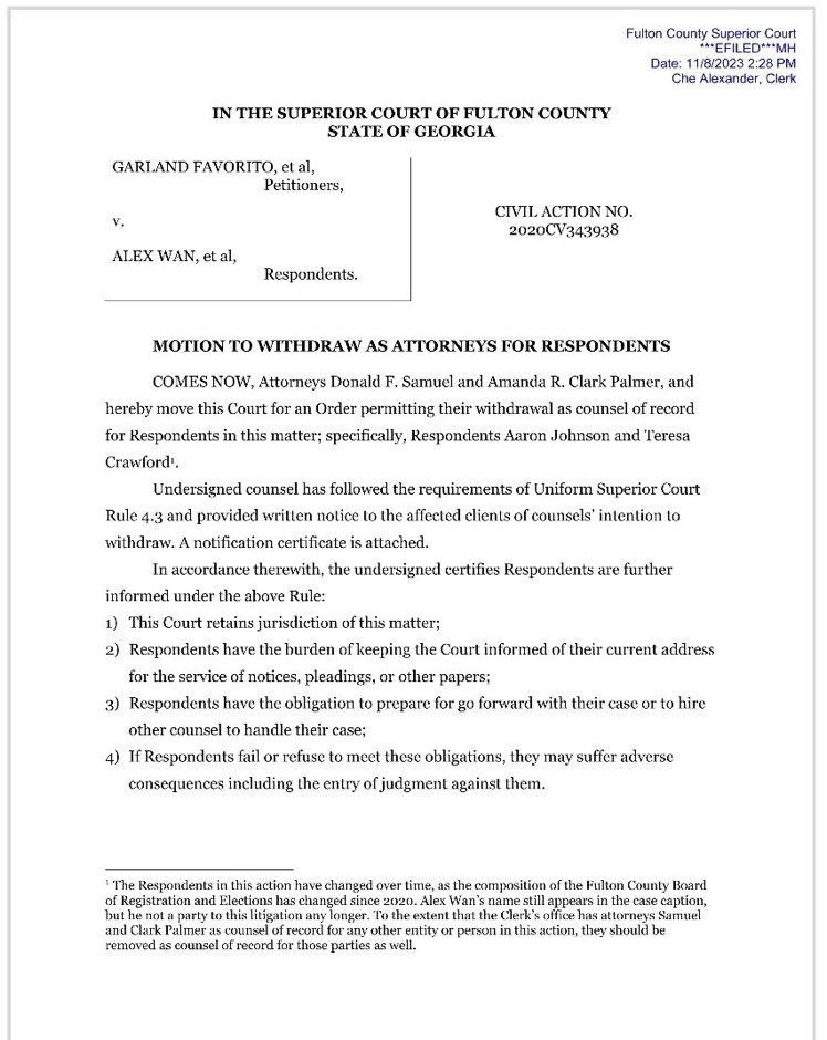 ๐จBREAKING - GA 2020 Stolen Election 2020 Fraudulent Ballot Case in Fulton County The big time CRIMINAL defense attorneys for Fulton County have filed a motion to withdraw from the case Why?!? Is Fulton County getting ready to admit the ballots donโt exist? They were ordered to produce the absentee ballots months ago Or have the ballots been destroyed? Stay tuned because this is only the tip of the iceberg Buckle up! Itโs comingโฆ https://x.com/AmyKremer/status/1722753773406142881?s=20 https://t.me/hazydays5150/322625