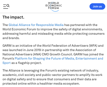 The Global Alliance for Responsible Media (GARM) is a “cross-industry initiative” (i.e., an agreement of the world’s largest and most powerful advertisers AND platforms) to demonetize what they consider “harmful content.”