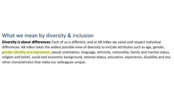 AB InBev has adopted a corporate policy that exalts “gender identity and expression” to the same level of significance as age and race.