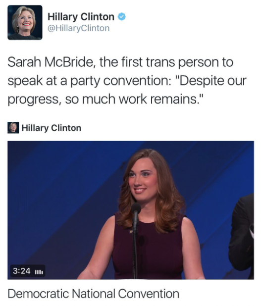 7/ Tim was backed by then-Vice President Joe Biden along with Hillary Clinton and the entire Democrat Party establishment, becoming the “first trans person” to speak at the Democrat National Convention. https://t.co/elG4fwCVZU