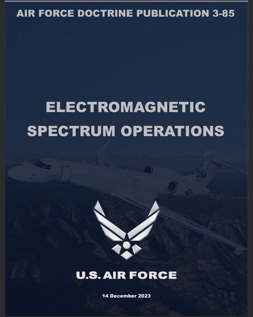 Electromagnetic Spectrum Operations doctrine Air Force Doctrine Publication 3-85 Modern service doctrine framing EMS operations and referencing the joint EMSO doctrine ecosystem. Link: https://www.doctrine.af.mil/Portals/61/documents/AFDP_3-85/AFDP%203-85%20Electromagnetic%20Spectrum%20Ops.pdf