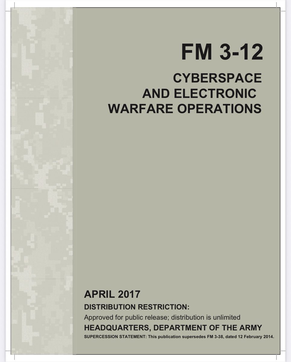 Army doctrine CYBERSPACE AND ELECTRONIC WARFARE OPERATIONS FM 3-12 Army’s combined framing, often discussed as CEMA: cyberspace + electromagnetic activities. Link: https://nsarchive.gwu.edu/sites/default/files/documents/3678217/Document-11-Department-of-the-Army-FM-3-12.pdf