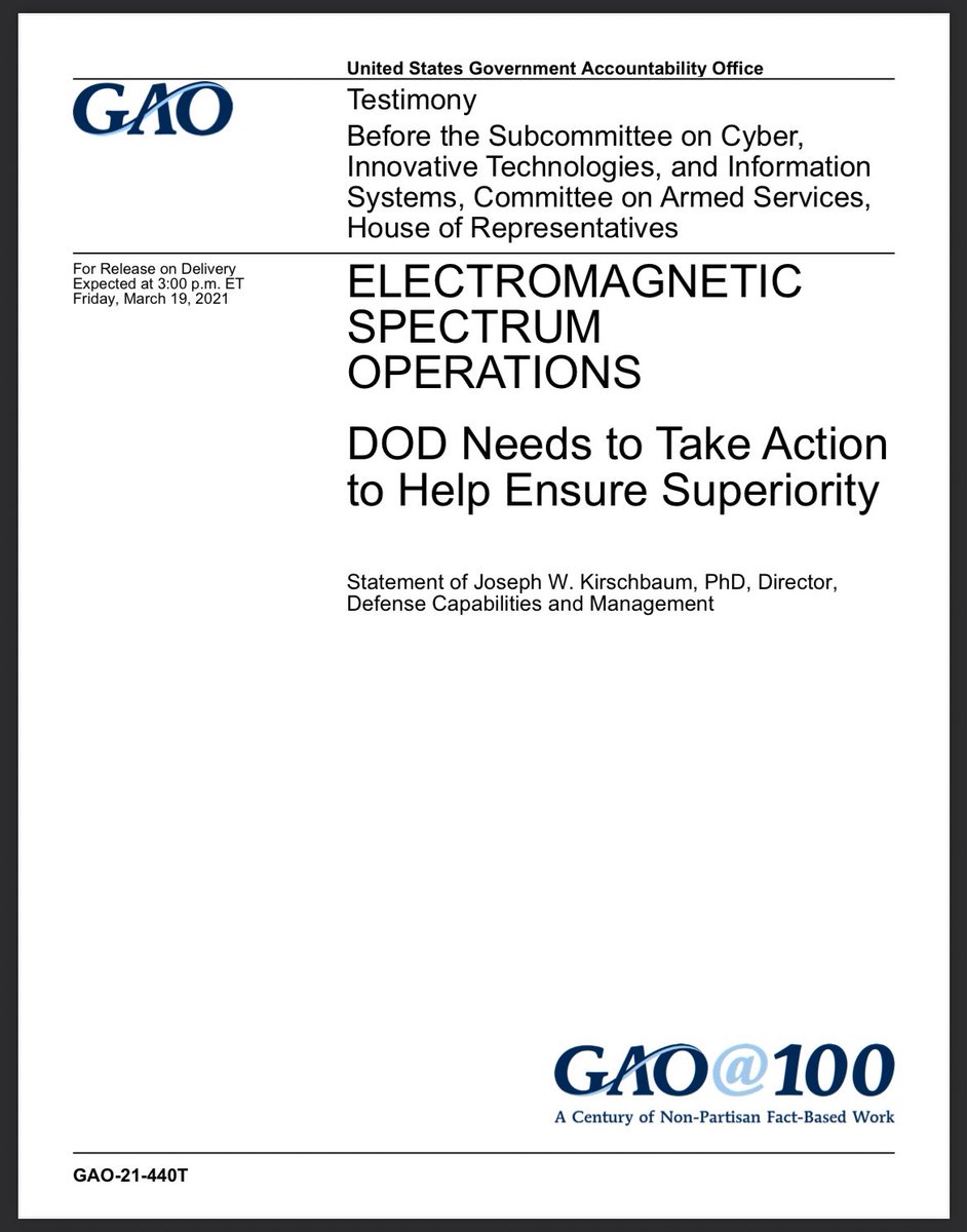 ELECTROMAGNETIC SPECTRUM OPERATIONS GAO The GAO warned DoD that the U.S. was not organized or prepared to control the electromagnetic spectrum in modern war. If you lose the spectrum, you lose communications, GPS, radar, and command and control. This report explains why EMSO and AI-enabled electronic warfare became a top Pentagon priority. Link: https://apps.dtic.mil/sti/trecms/pdf/AD1163104.pdf