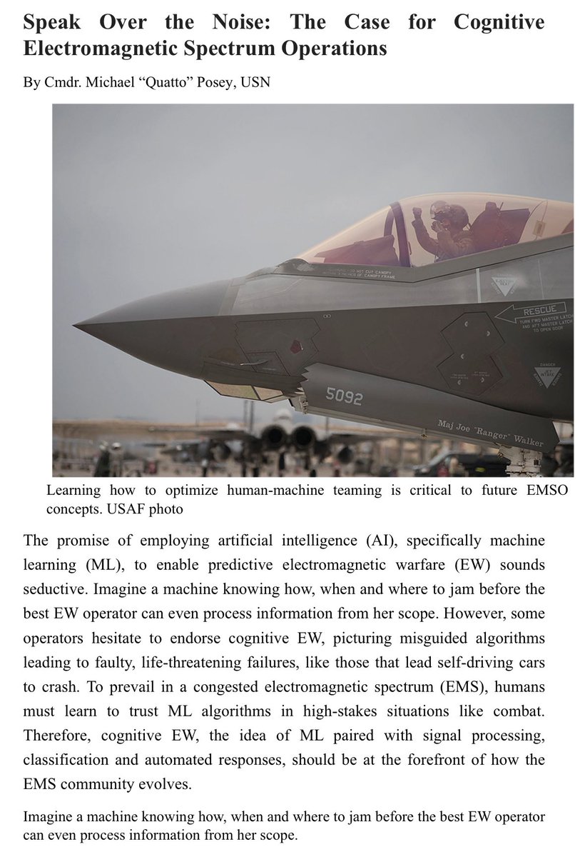 Professional EW community argument for “cognitive EMS operations” Link: https://www.jedonline.com/2023/03/22/speak-over-the-noise-the-case-for-cognitive-electromagnetic-spectrum-operations/