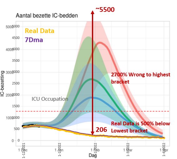 Even in de herhaling voor de mensen die het gemist hebben. Het RIVM model dat ons Nederlanders als enige land met kerst in lockdown bracht zat er maar liefst 2700% naast. Werkelijke data [geel] tot mei 2022 ver onder het onderste onzekerheidsinterval. Evaluatie? Gevolgen?