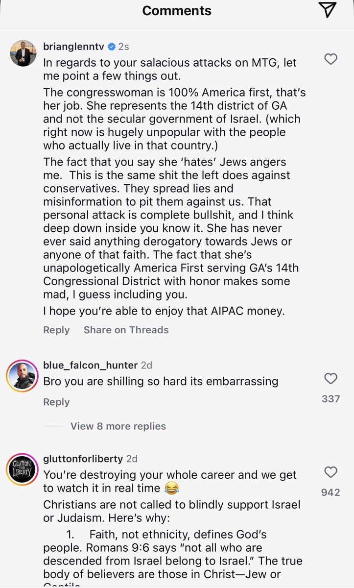 Many prominent “America first” social media influencers are clearly getting paid by a foreign government aligned people to literally influence your opinion about me by lying about me and slandering me! Thank you Brian Glenn for setting the record strait!! I’m UNAPOLOGETICALLY AMERICA ONLY!!! That is what the entire U.S. House of Representatives should be!! Any U.S. elected official and American who puts the SECULAR (NOT BIBLICAL) Government of Israel FIRST is NOT America First!!! They should register under FARA - Foreign Agents Registration Act, a U.S. law that requires individuals and entities acting on behalf of foreign interests to disclose their relationships and activities to the Department of Justice. MANY PEOPLE are absolutely fed up with this to the point they are going to question future candidates running for office if they will refuse to take AIPAC donations. America is my home and it’s the ONLY COUNTRY I’M FIGHTING FOR!!!