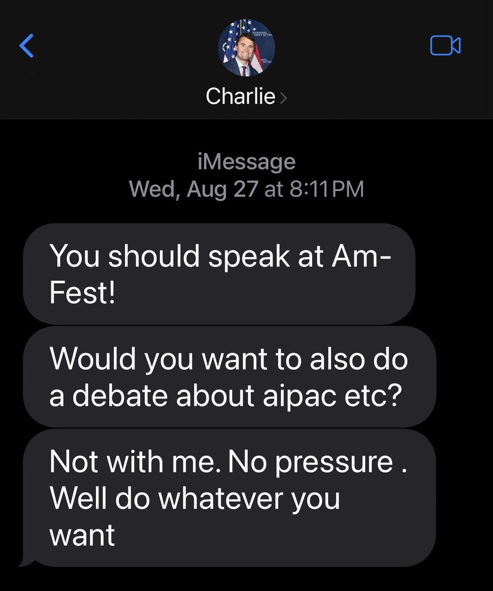 Charlie Kirk invited me to speak at Amfest a few weeks ago before he was martyred. This was after I called for AIPAC to register under FARA and said that the nuclear armed secular government of Israel was committing genocide in Gaza and killing innocent children, Christians, and people. He asked if I wanted to debate about AIPAC but made it clear NOT against him. He said “we”, him - TPUSA, would do whatever I want on the issue. If you don’t know who to believe, between Bibi Netanyahu (a foreign country’s leader) or Charlie’s personal friends Candace Owens and Tucker Carlson, I’m posting my last text message with Charlie. Believe Candace Owens and Tucker Carlson. And at the same time always remember: 1. Charlie Kirk is an American Christian. 2. Charlie Kirk is a devoted loving husband and father. 3. Charlie Kirk is a Christian movement leader, a giant in American history. 4. Charlie Kirk is a Christian martyr for Jesus Christ. 5. Charlie Kirk is a Free Speech warrior and was committed to non-violent debate. Do not allow a foreign country, foreign agents, and another religion tell you about Charlie Kirk. And I hope a foreign country and foreign agents and another religion does not take over Christian Patriotic Turning Point USA.