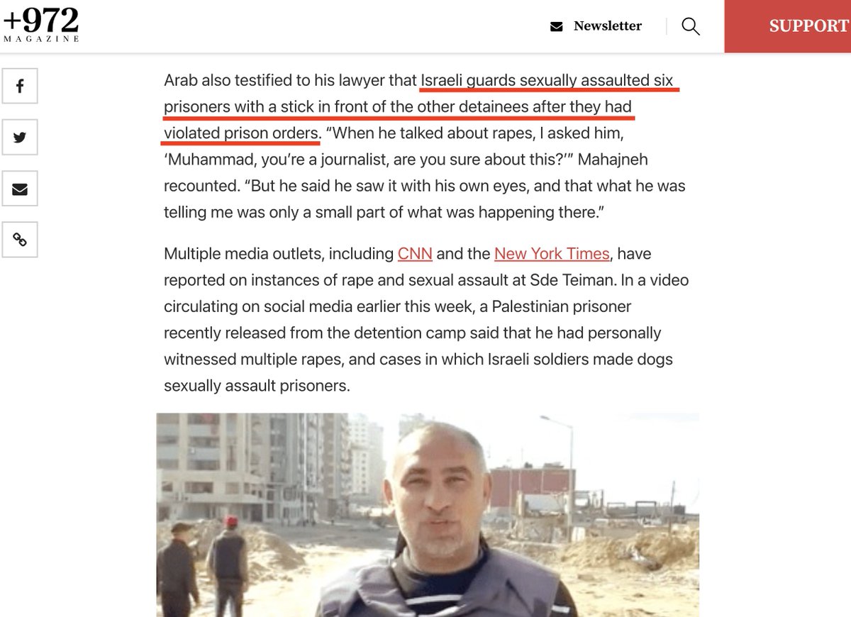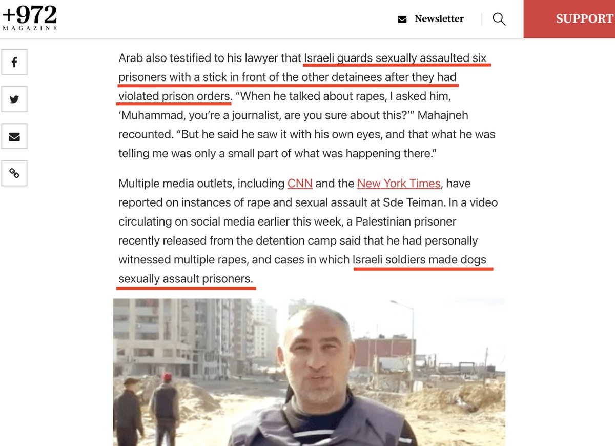 9\ In June, a Gazan survivor of the Sde Teiman detention camp said Israeli soldiers made dogs sexually assault & rape kidnaped Palestinians. +972 is the first Israeli publication to report his testimony. https://t.co/flfh1o3xJy