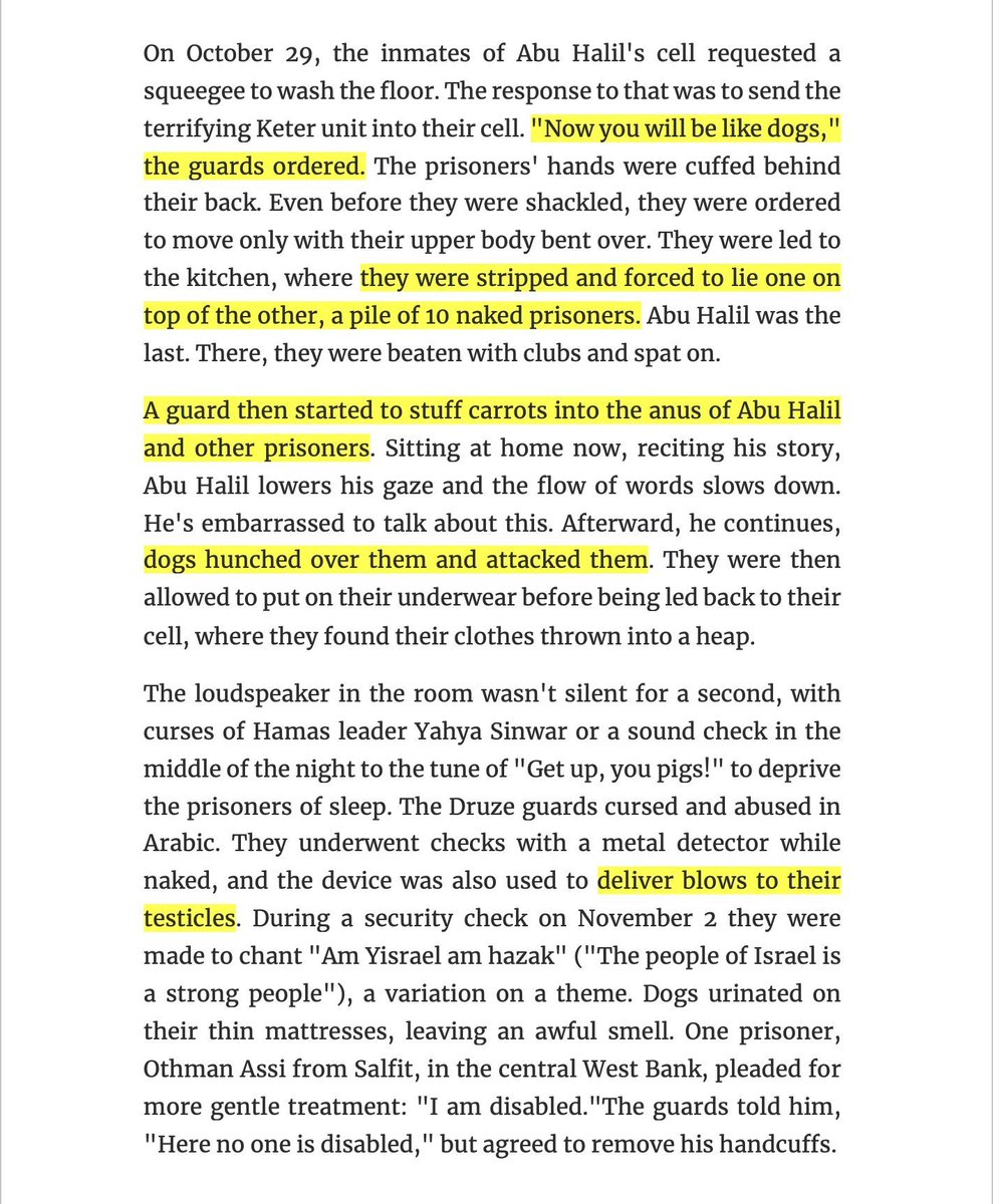 ๐จIsrael is RAPING & sexually assaulting Palestinian detainees: "They were led to the kitchen, where they were stripped & forced to lie one on top of the other.... They were beaten with clubs & spat on. A guard then started to stuff carrots into the anus of Abu Halil & other prisoners."