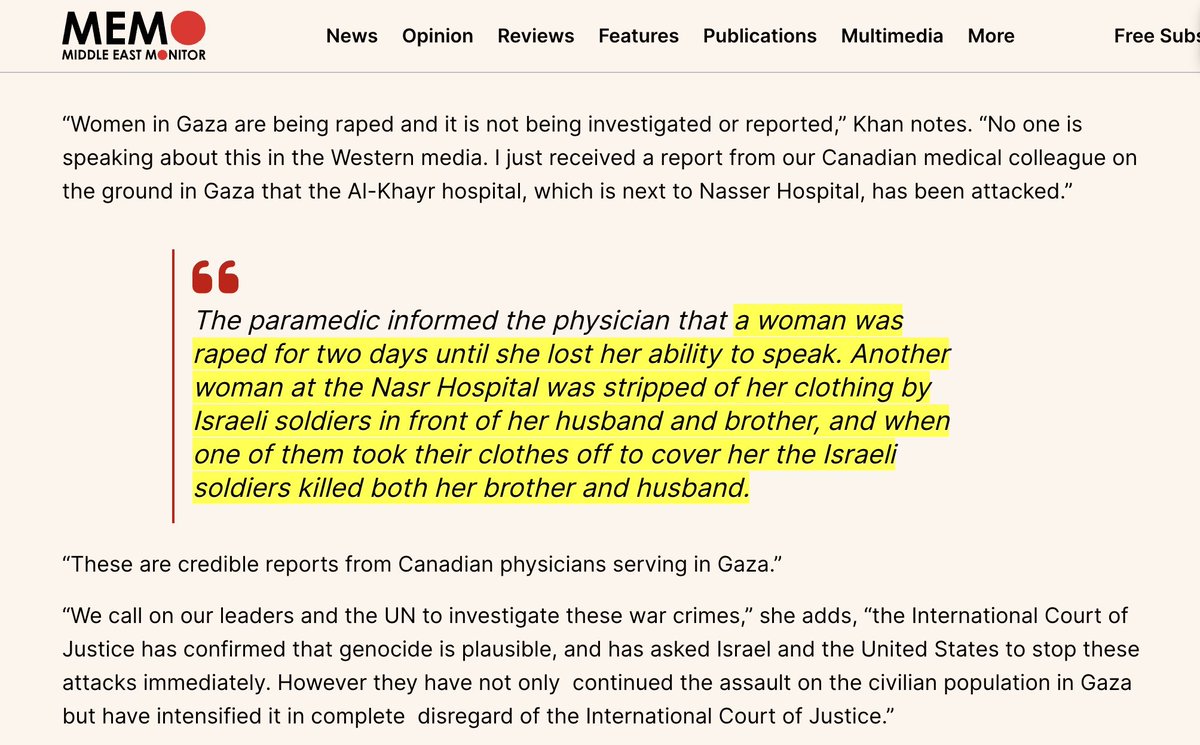 5\ In March, a Canadian doctor was informed of a case of a Gazan woman who "was raped for 2 days [by the IDF] until she lost her ability to speak". Another "was stripped of her clothing by Israeli soldiers in front of her husband & brother", when they protested, IDF killed both https://middleeastmonitor.com/20240324-women-in-gaza-are-being-raped-and-this-is-not-being-investigated-or-reported