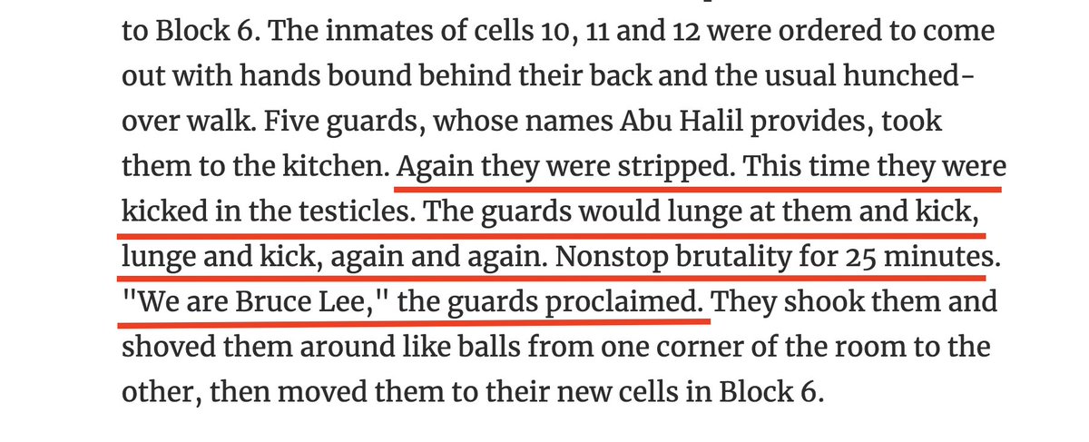 2\ Israel's sexual abuse of those detainees that spoke up was a routine: "Again they were stripped. This time they were kicked in the testicles. The guards would lunge at them & kick, lunge & kick, again & again. Nonstop brutality for 25 minutes. 'We are Bruce Lee,' the guards proclaimed. They shook them & shoved them around like balls from one corner of the room to the other, then moved them to their new cells in Block 6."