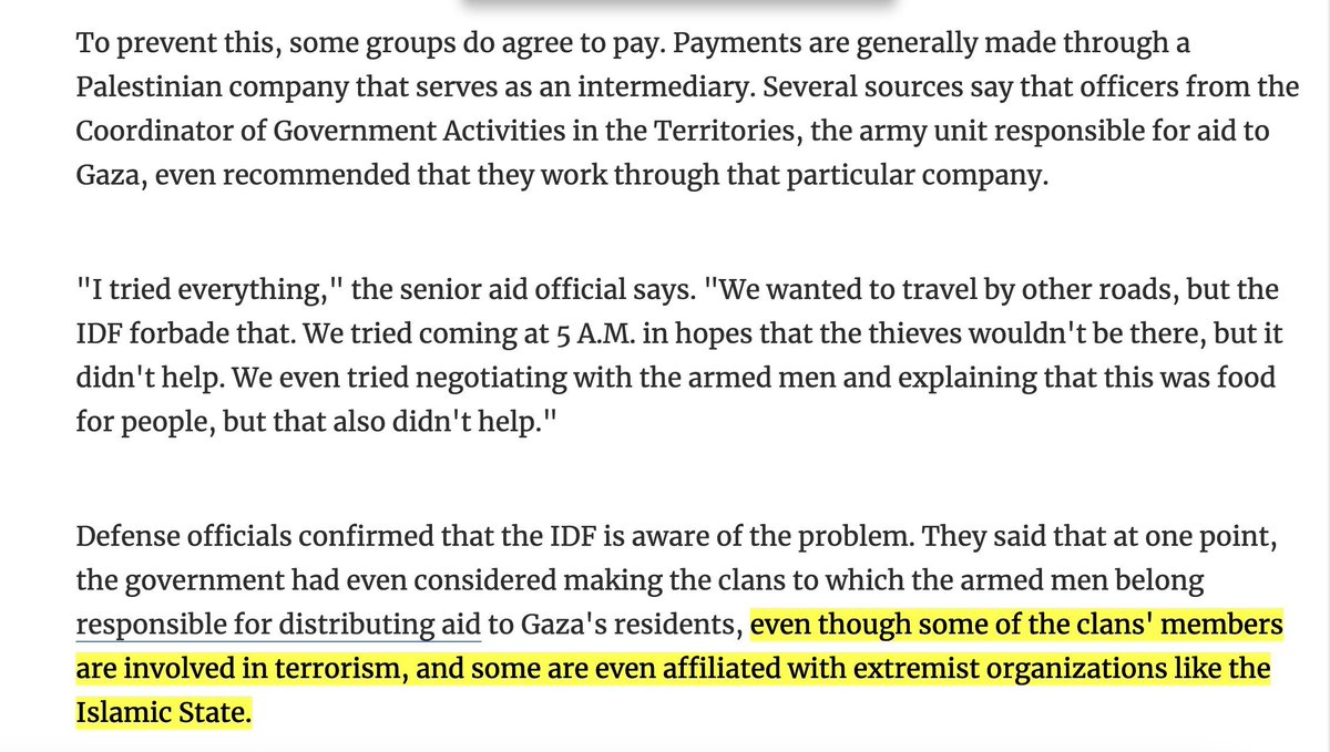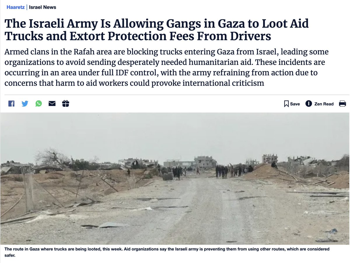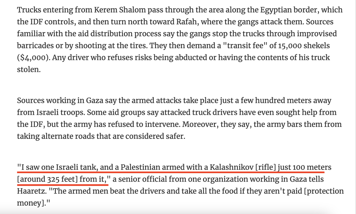 3\Haaretz confirms the gangs looting aid under IDF protection are affiliated with terrorist groups like ISIS The gangs operate just 100 meters from IDF tanks & troops, who only fire at civilians or policemen entering the area but never at those gangs https://www.haaretz.com/israel-news/2024-11-11/ty-article/.premium/the-idf-is-allowing-gaza-gangs-to-loot-aid-trucks-and-extort-protection-fees-from-drivers/00000193-17fb-d50e-a3db-57ff16af0000